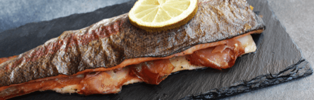 • Sazonamos las truchas al gusto y las rellenamos con una loncha de jamón serrano.